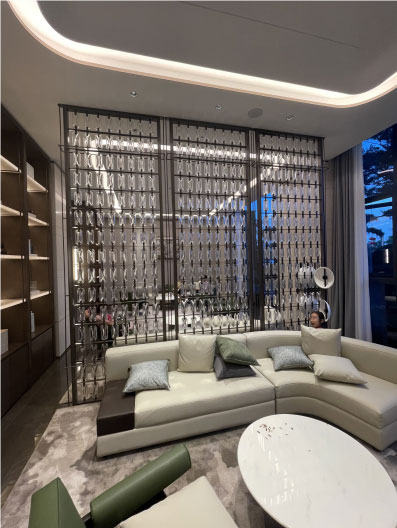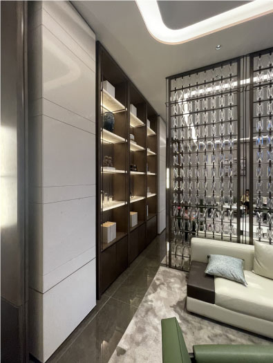 休息區的不銹鋼置物架和工藝屏風,為客戶提供更舒適的洽談環境